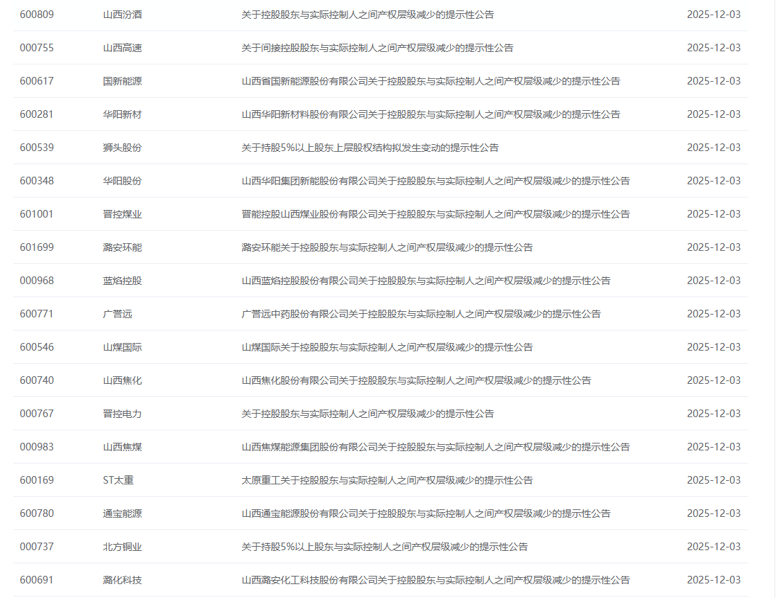 据上交所、深交所、北交所官网消息,12月2日至3日期间,山西省18家A股上市公司陆续发布公告,宣布其控股股东股权将由山西省国有资本运营有限公司划转至山西省国资委直接持有。